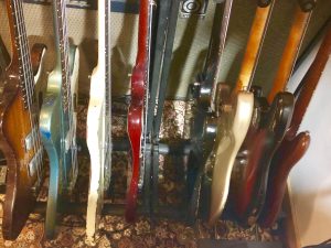 マイルームのギタースタンドに並んだベース7本とギター1本。