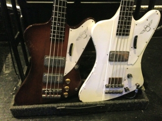 つい最近ブリッジを交換したりジャックの位置を変えたりっていうカスタマイズをして、最近頻繁に使ってる’64年製黒バード『BIB』とイメージを近づけないようにピックガードを黒に戻したのもあって、ついついエログロに手が伸びちゃったんだな。もう1本、’64年製白バード『ユニセフ』を使った。同じステージで同じ条件でヴィンテージと持ち替えて弾いたから、2本の音の差は歴然。最近のメインにしてるヴィンテージバードとは違う音色だけど、3点止めブリッジからテイルピースが付いてるヴィンテージタイプのブリッジに交換したことで音色的も更にオレ好みに近づいたし、エログロの良さはヴァリエーションとして全然アリだわ。