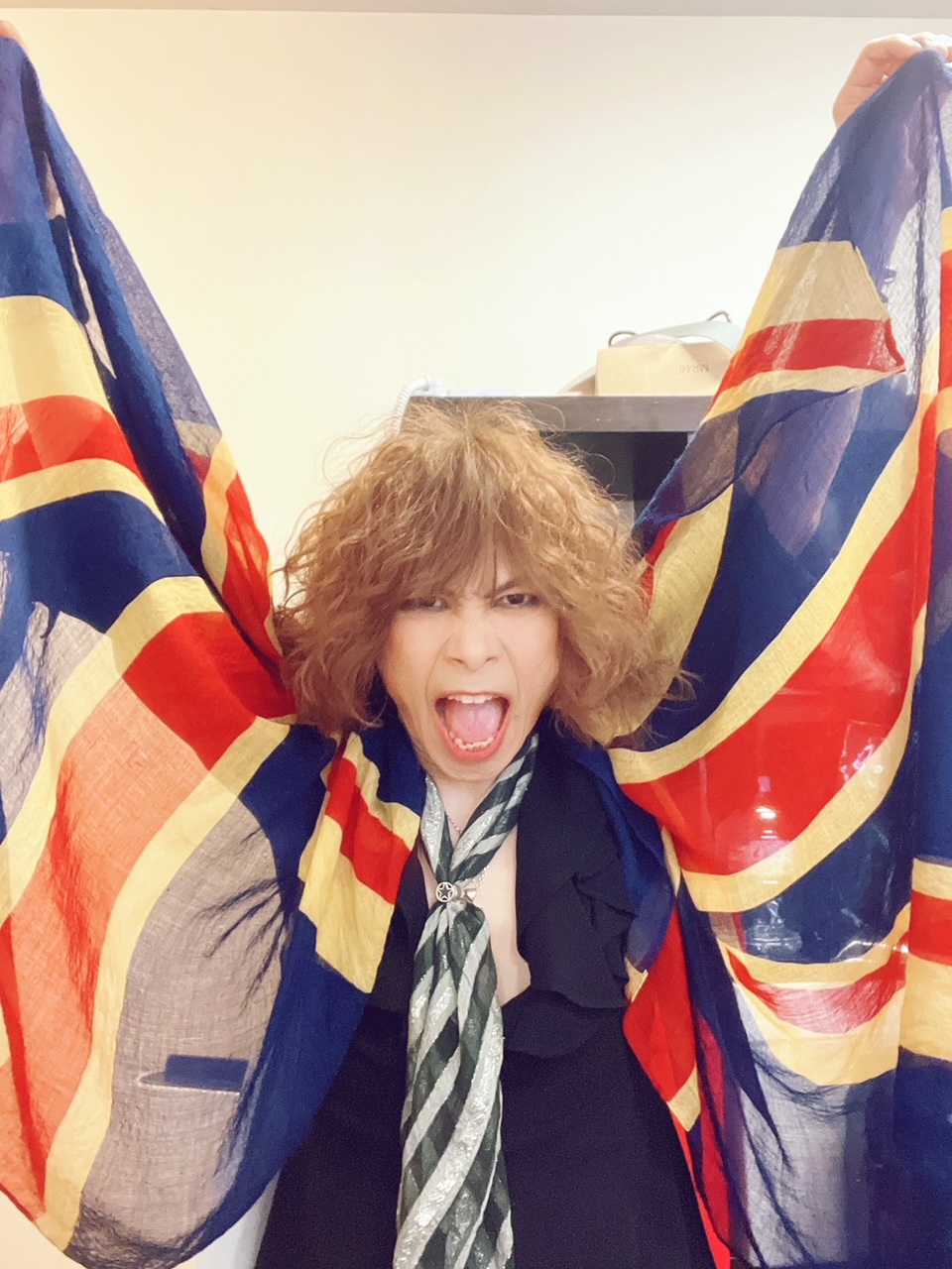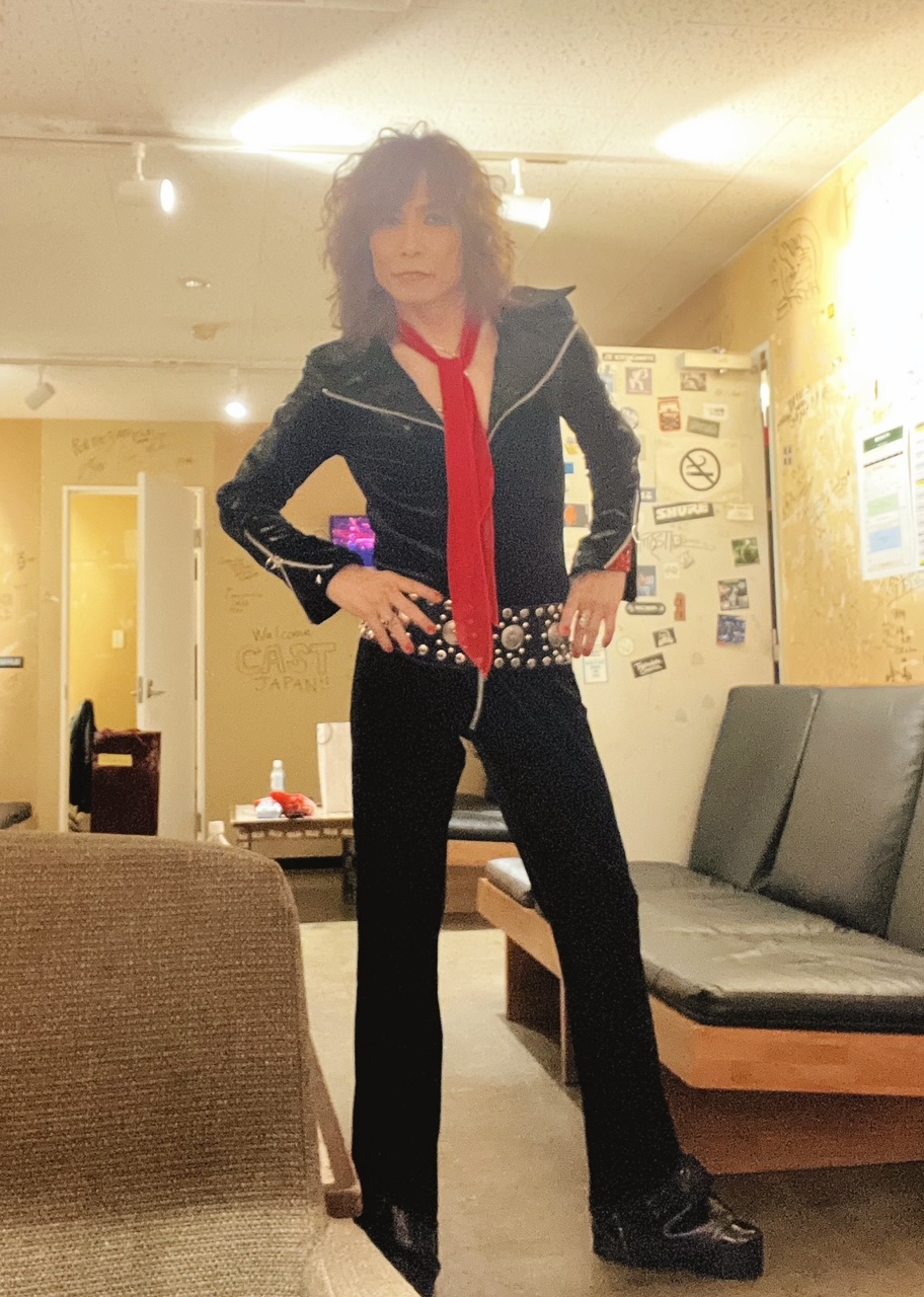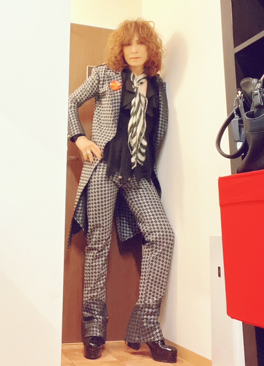 衣装は、TYOの2015年頃のセットアップとTHE YELLOW MONKEYの’90年代のインナーの黒フリルシャツ! 黒銀ストライプのスカーフはfrom London!!