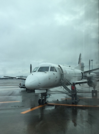 鹿児島→松山は、雨の中プロペラ機で移動。外タレっぽくてなかなかいいっしょ?
